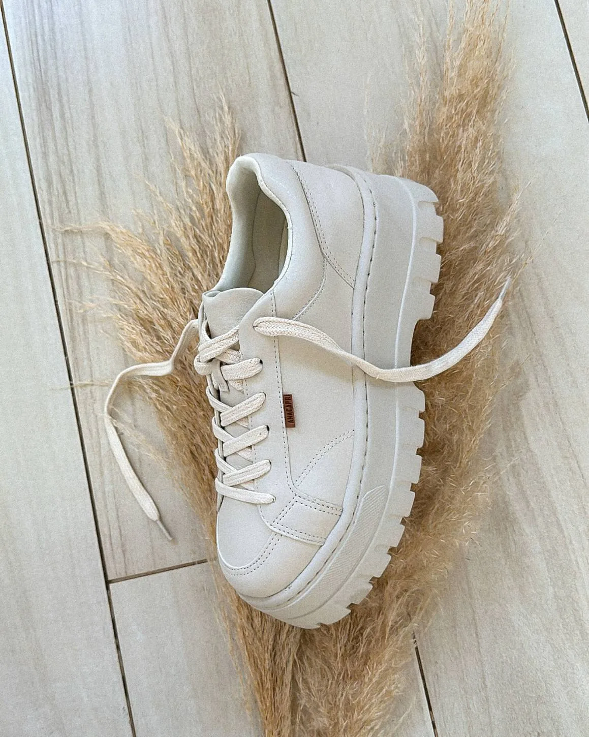 ”O modelo traz solado flatform tratorado robusto e imponente. Com biqueira arredondada e de material similar ao couro, o modelo monocromático traz cabedal em recortes com contorno em pespontos. Com colarinho acolchoado, proporciona maior conforto no calce. De amarração superior em atacadores da mesma cor do tênis, traz tag marrom Anacapri na lateral.”