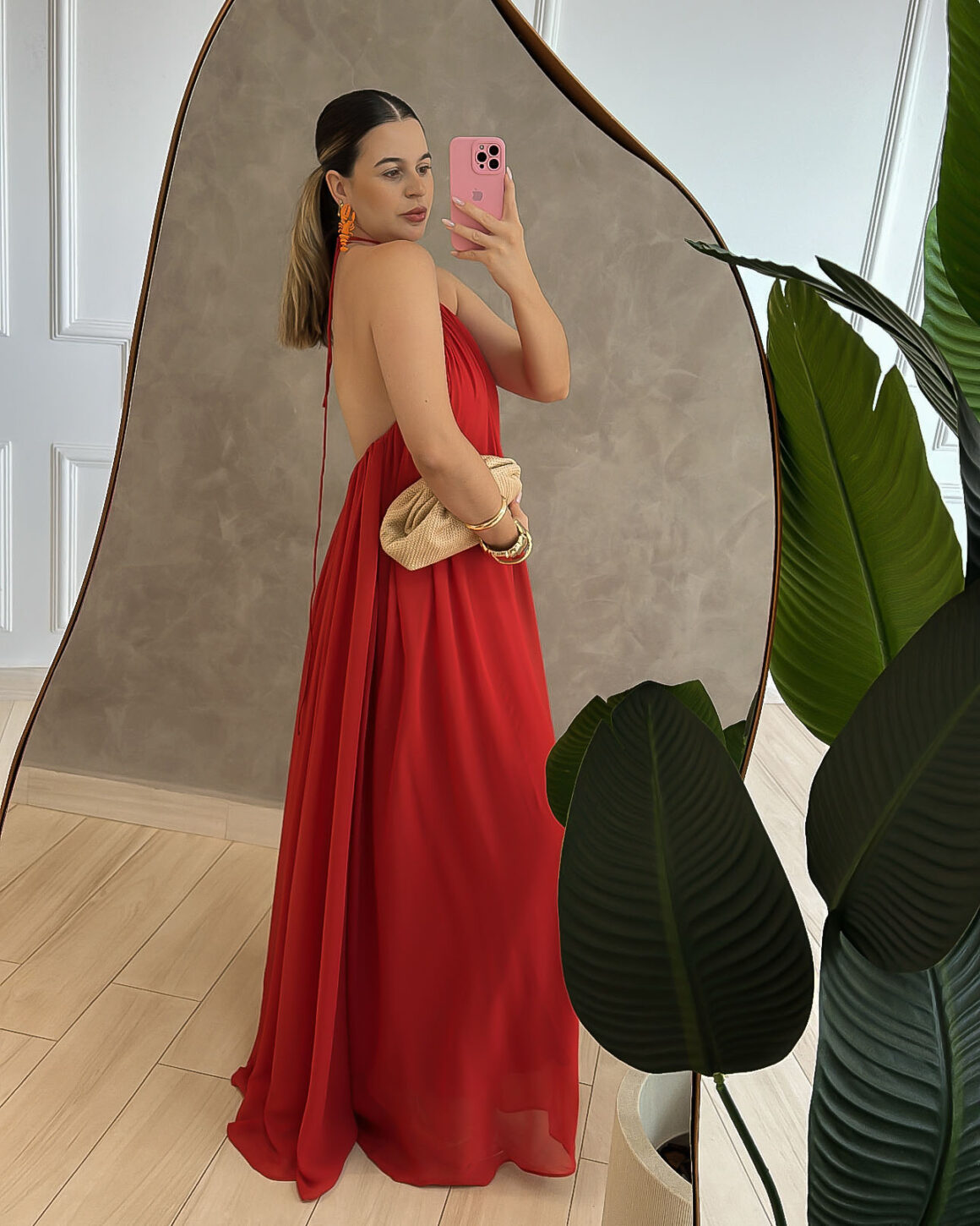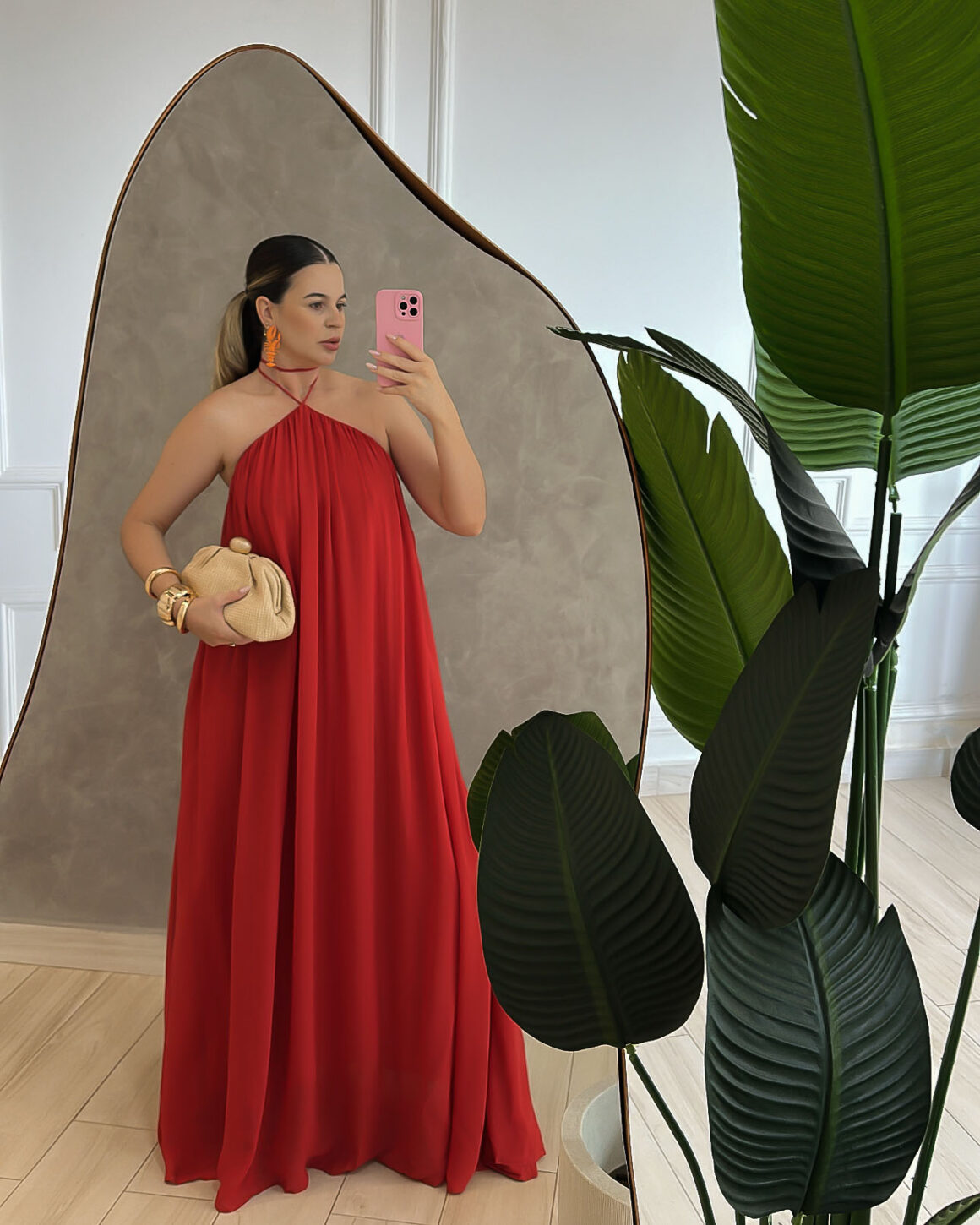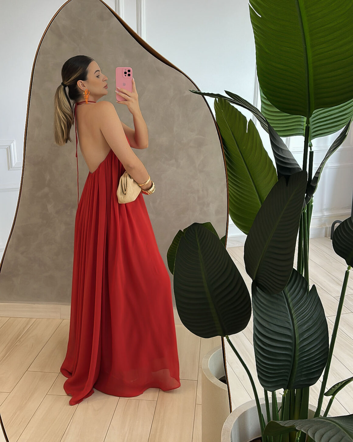 - Este modelo encanta com alças finas que amarram delicadamente no pescoço formando um decote suave